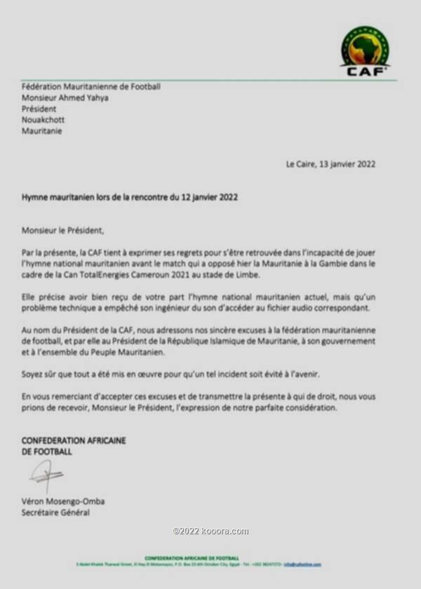 ونشر الاتحاد الموريتاني لكرة القدم على صفحته الرسمية بموقع فيسبوك اليوم رسالة اعتذار الكاف التي جاء فيها: "سيدي الرئيس، يعرب الاتحاد الأفريقي لكرة القدم عن أسفه لعدم تمكنه من عزف النشيد الوطني الموريتاني قبل المباراة التي جمعت أمس بين موريتانيا وغامبيا في إطار كأس الأمم الأفريقية على ملعب ليمبي".